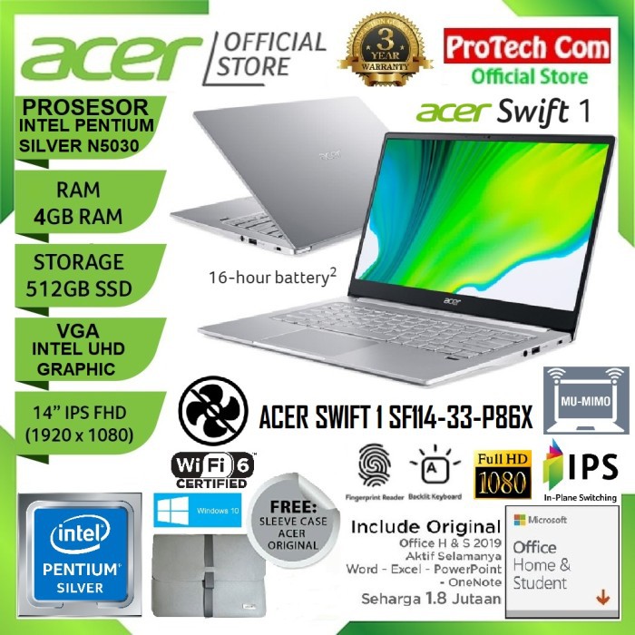 Jual Acer Swift 1 Sf114 33 Pentium N5030 4gb 512gb 14 Ips Fhd W10 Ohs Online Maret 2021 Blibli
