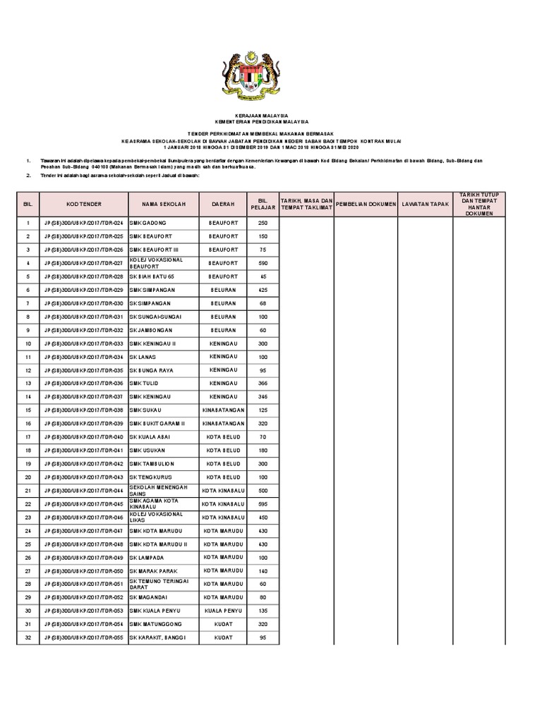 Tender Perkhidmatan Membekal Makanan Bermasak Ke Asrama Sekolah Sekolah