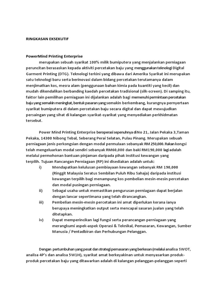 Kertas Kerja Rancangan Perniagaan Percetakan Baju